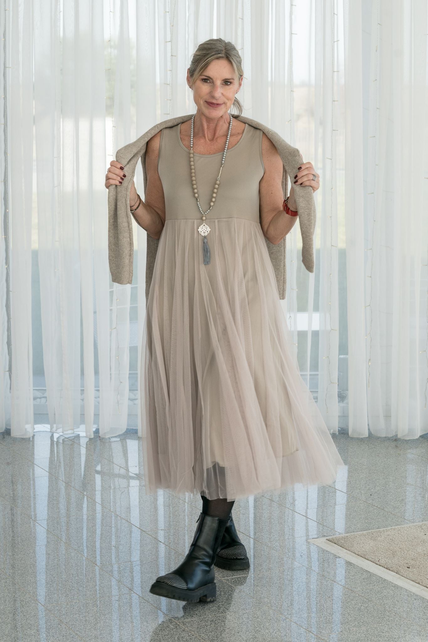 Der Look schmeichelt auch Frauen mit mehr Kurven, denn das Tüllkleid fällt locker.