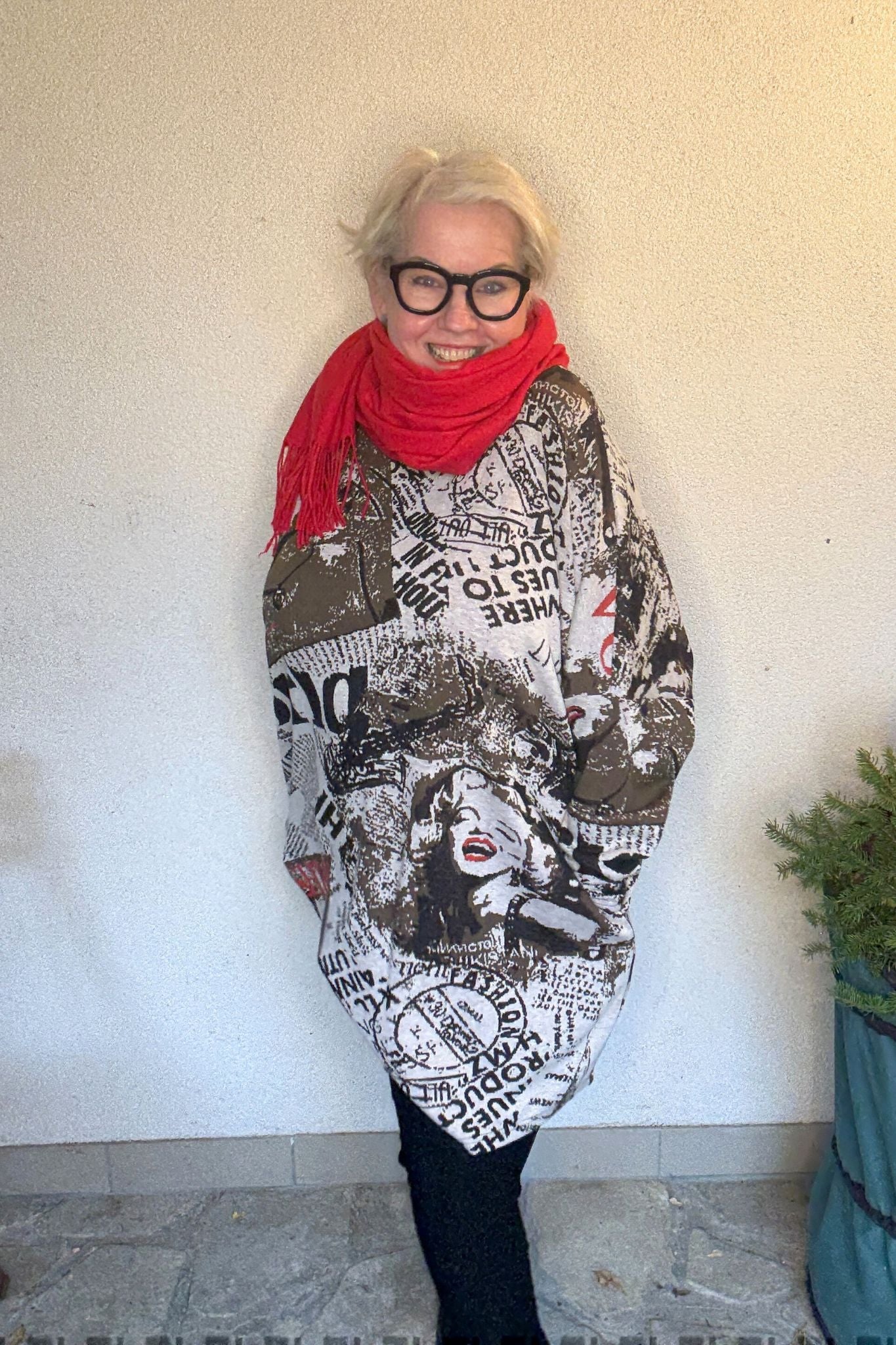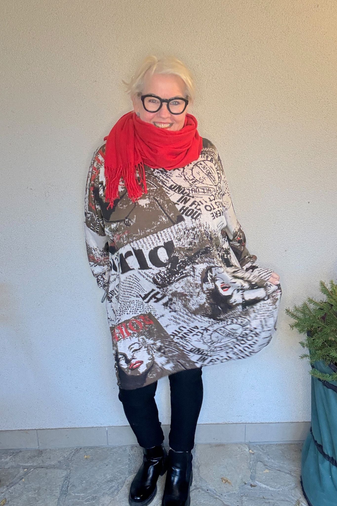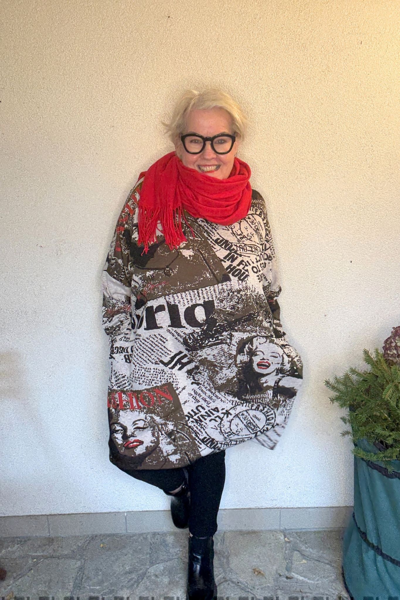 Diese Oversize-Tunika ist ein Statement für sich: softer Jersey-Mix, ikonischer Zeitungsprint und eine Silhouette, die jeder Figur schmeichelt. Der lockere Rundhalsausschnitt (unter dem Schal gut sichtbar) macht das Teil zum perfekten Alltags- & Ausgeh-Begleiter.