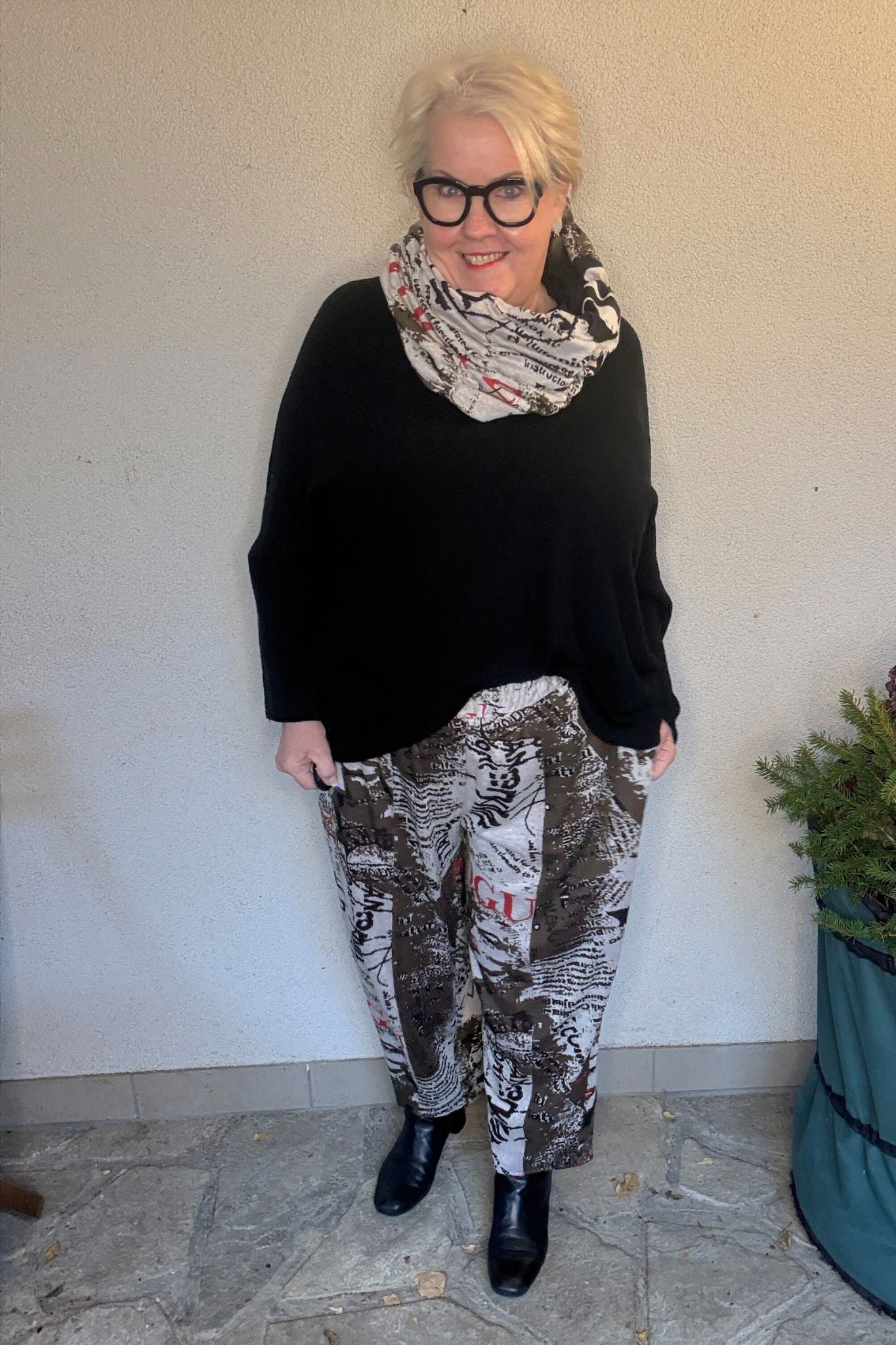 Der markentypische „Vogue Art“-Print in Olive und sehr hellem Beige macht die Hose zum absoluten Hingucker – elegant, edgy und perfekt für Curvy Ladies.