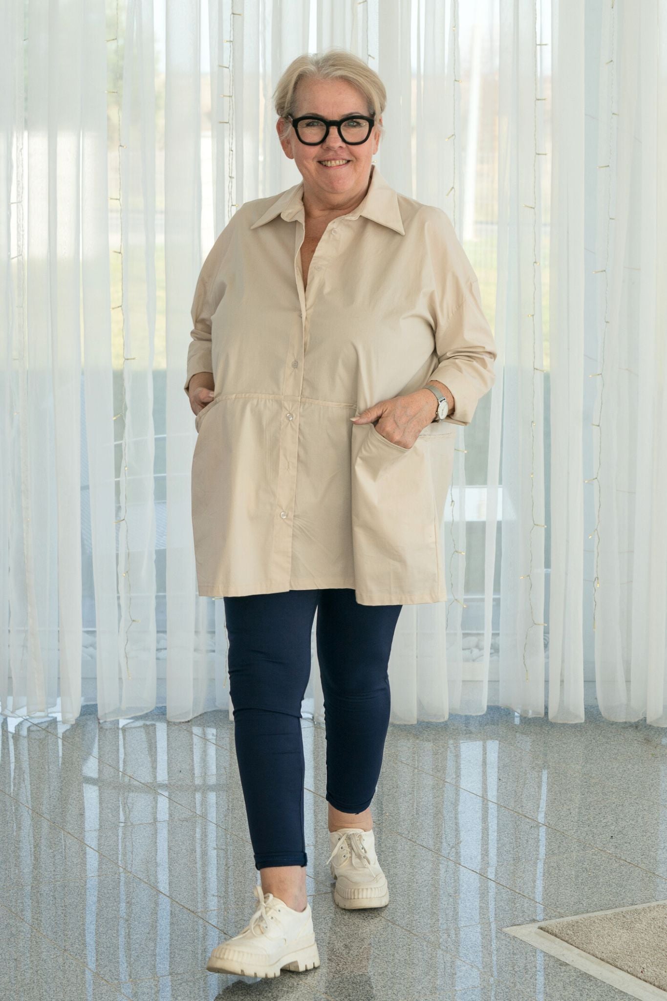 Mit auffälligen Ohrringen und Sneakern wirkt sie modern und frisch, mit schlichten Accessoires und Loafern sofort edel.