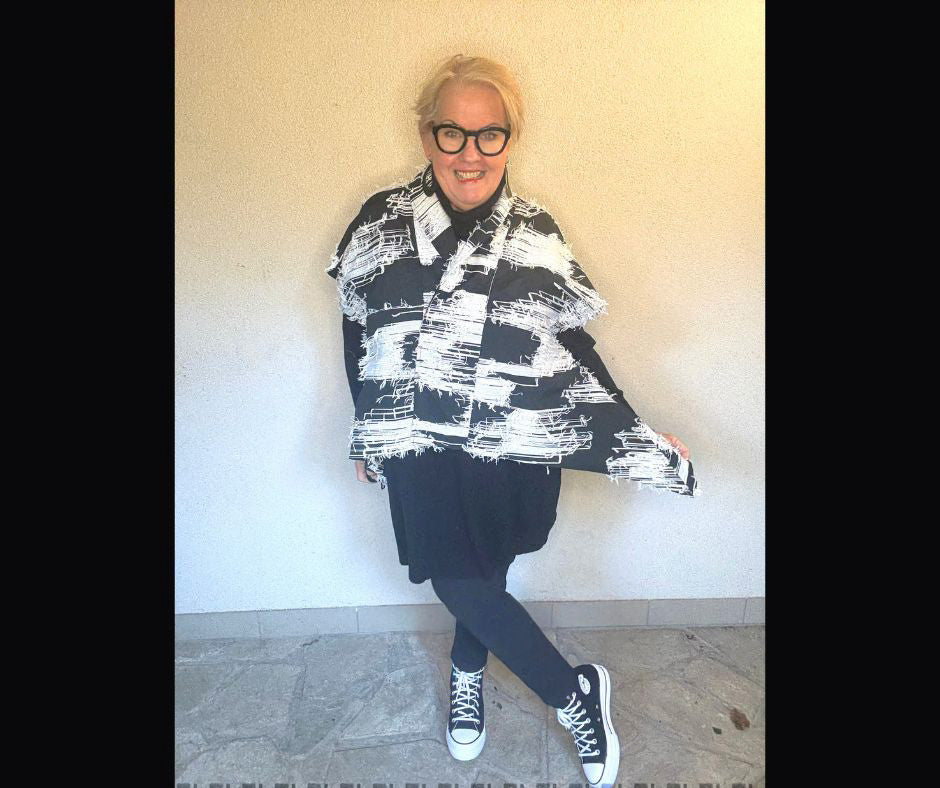 Lässig über Kleid, Longshirt oder Jeans kombiniert, bringt es sofort Kunstgalerie-Vibes in deinen Alltag.