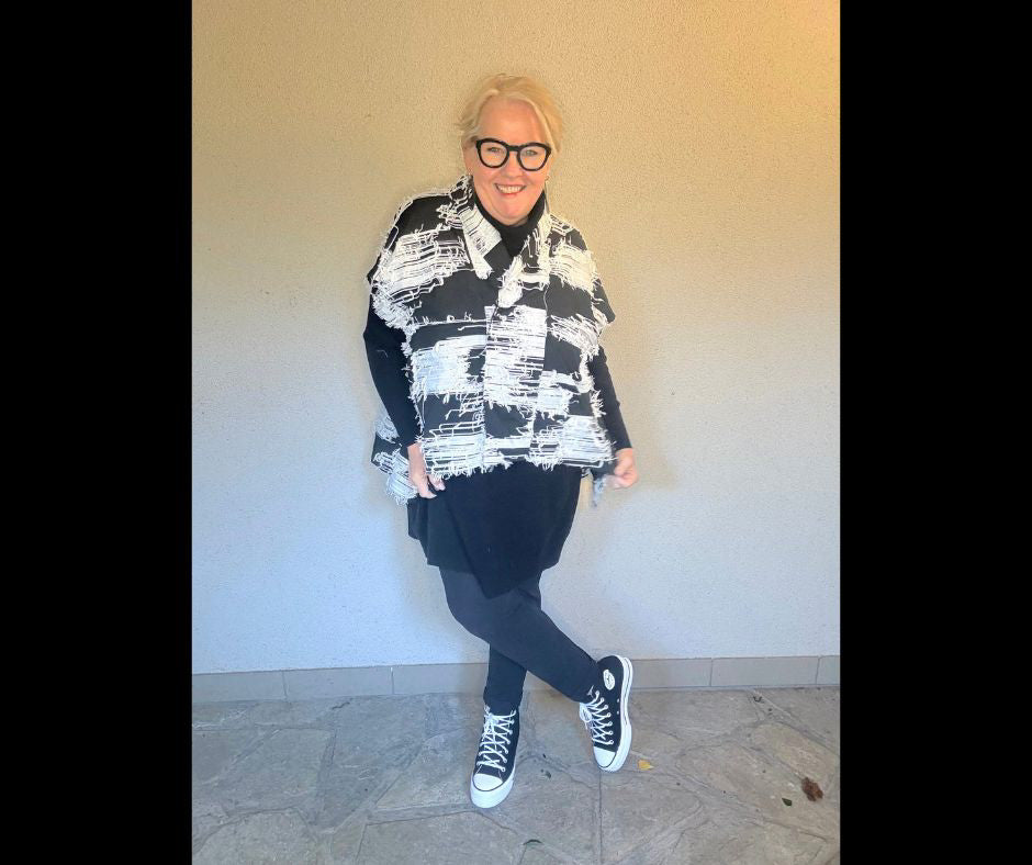 Der coole Schwarz-Weiß-Print mit fransigen Kanten macht jedes Outfit zur Leinwand für deinen Style.