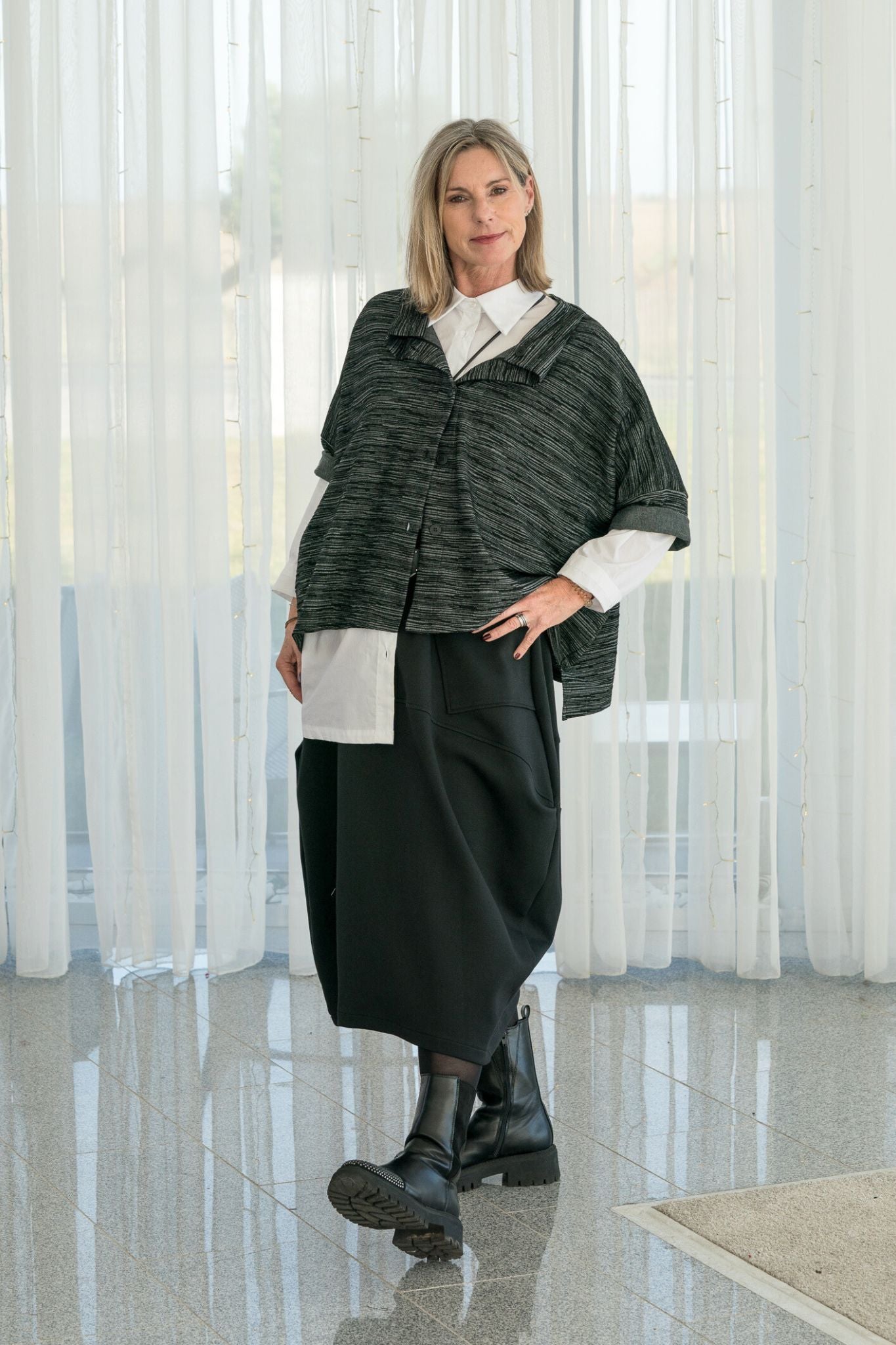 Kombiniere den Hosenrock mit der passenden Jacke und der langen Bluse aus unserem Shop – das ergibt einen coolen, modernen Lagenlook. Dazu lässige Boots oder Sneaker, und du bist perfekt gestylt – egal ob im Alltag oder fürs Büro.