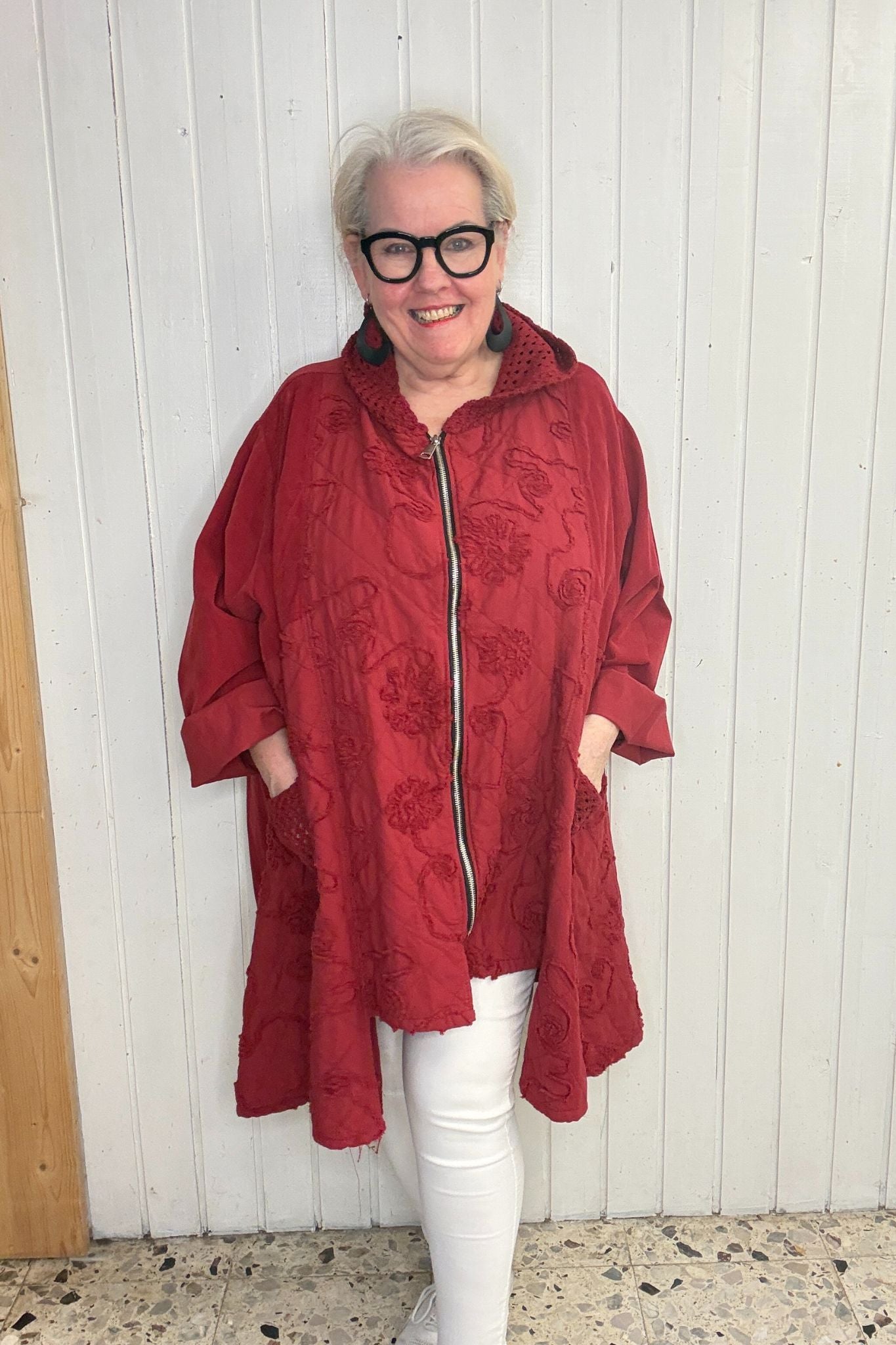 Jacke mit Struktur & Kapuze - weinrot