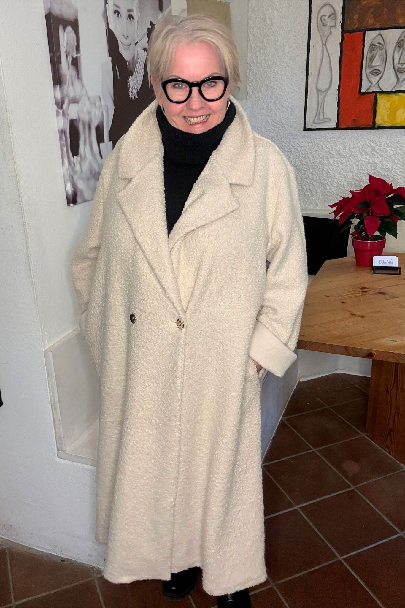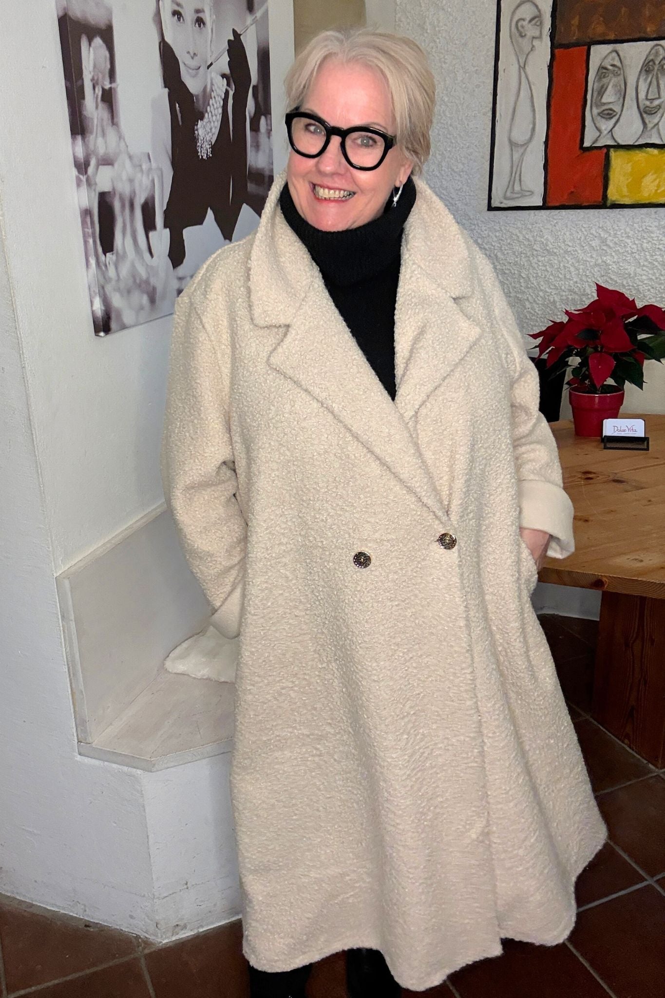 Dieser cremefarbene Bouclé-Mantel ist nicht nur warm und stylisch – er bringt auch doppelte Snoopy-Power auf den Rücken! Zwei verschiedene Rückseiten-Designs machen ihn zu einem echten Sammlerstück.