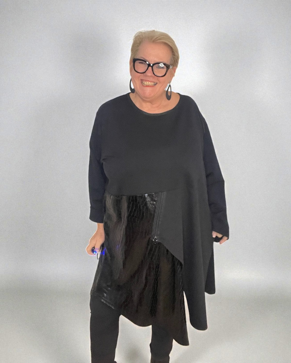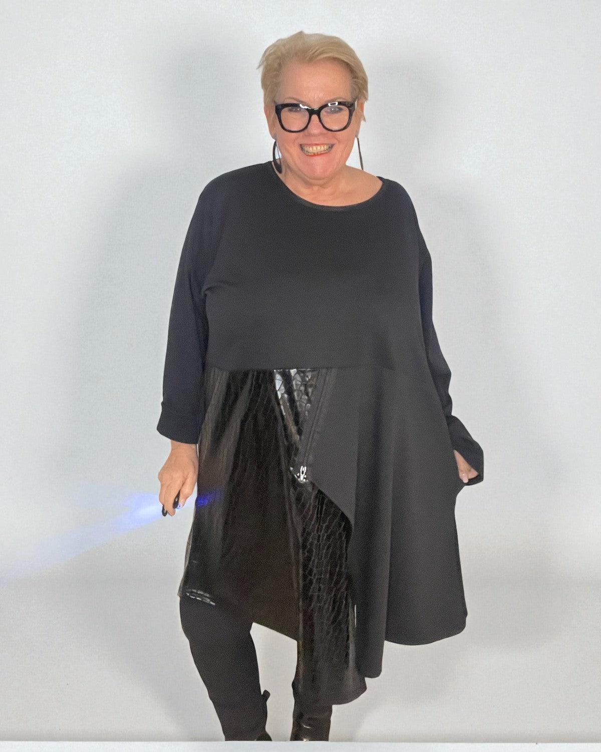 Sie ist ein Statement von AKH-Fashion - locker fallend, mit glänzendem Effektstoff und asymmetrischem Schnitt, der alles kann – kaschieren, betonen und Eindruck machen.